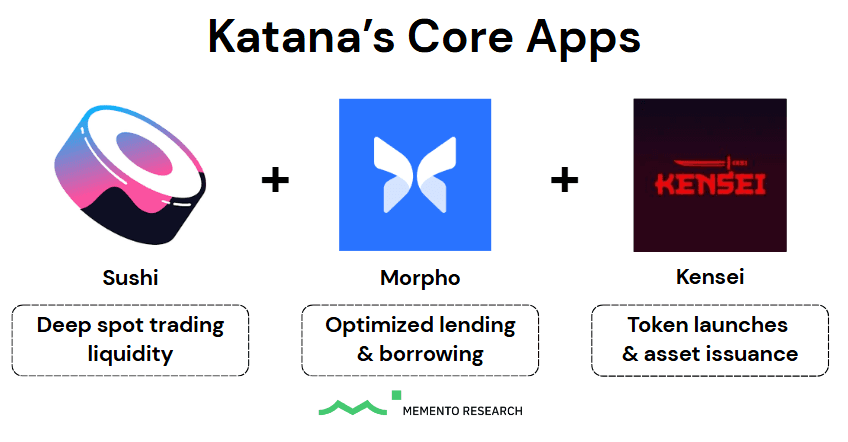 Katana's core stack revolves around Sushi, Morpho, and Kensei, which together form the foundation of its on-chain liquidity engine.