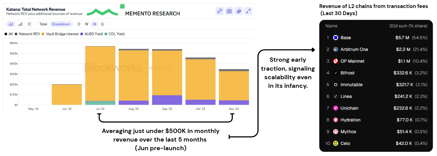 Most L2s live and die by transaction fees. Katana built a different economic engine. Thanks to VaultBridge interest, AUSD treasury yields, and CoL returns, Katana's financial inflows are driven primarily by on-chain yield rather than user gas fees. The network has averaged just under $500K in total monthly revenue over its first five months, where yield-generation accounts for most of the inflows.