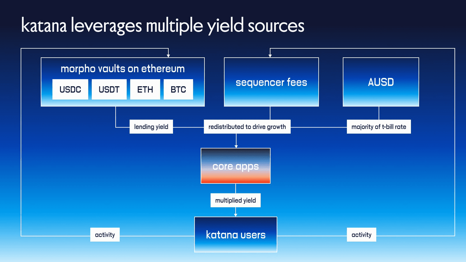 Only users who actively deploy their vbTokens into lending pools, DEX liquidity pairs, or other productive strategies receive the upstream yield boost. Every bridged dollar generates Ethereum yield that fuels Katana's economy, but only active vbToken deployment earns the boost, making participation, not possession, the currency of reward.