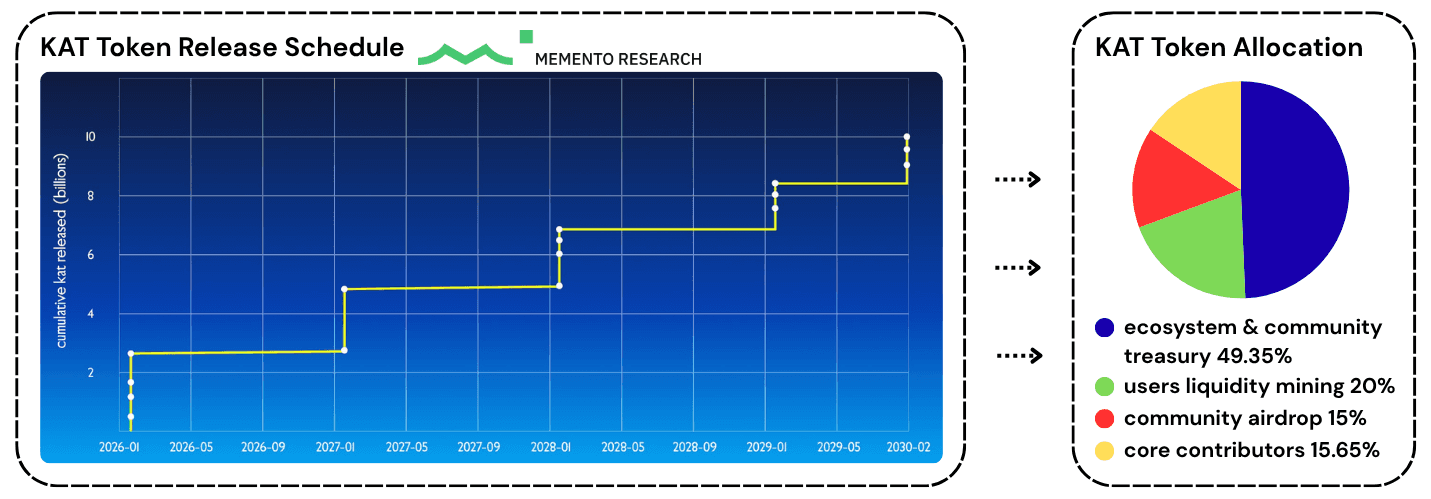 The release schedule unfolds gradually over four years and all KAT distributed at launch remains locked for nine months, reducing early sell pressure and encouraging long-term participation, with transfers expected to open around February 2026 pending community approval.