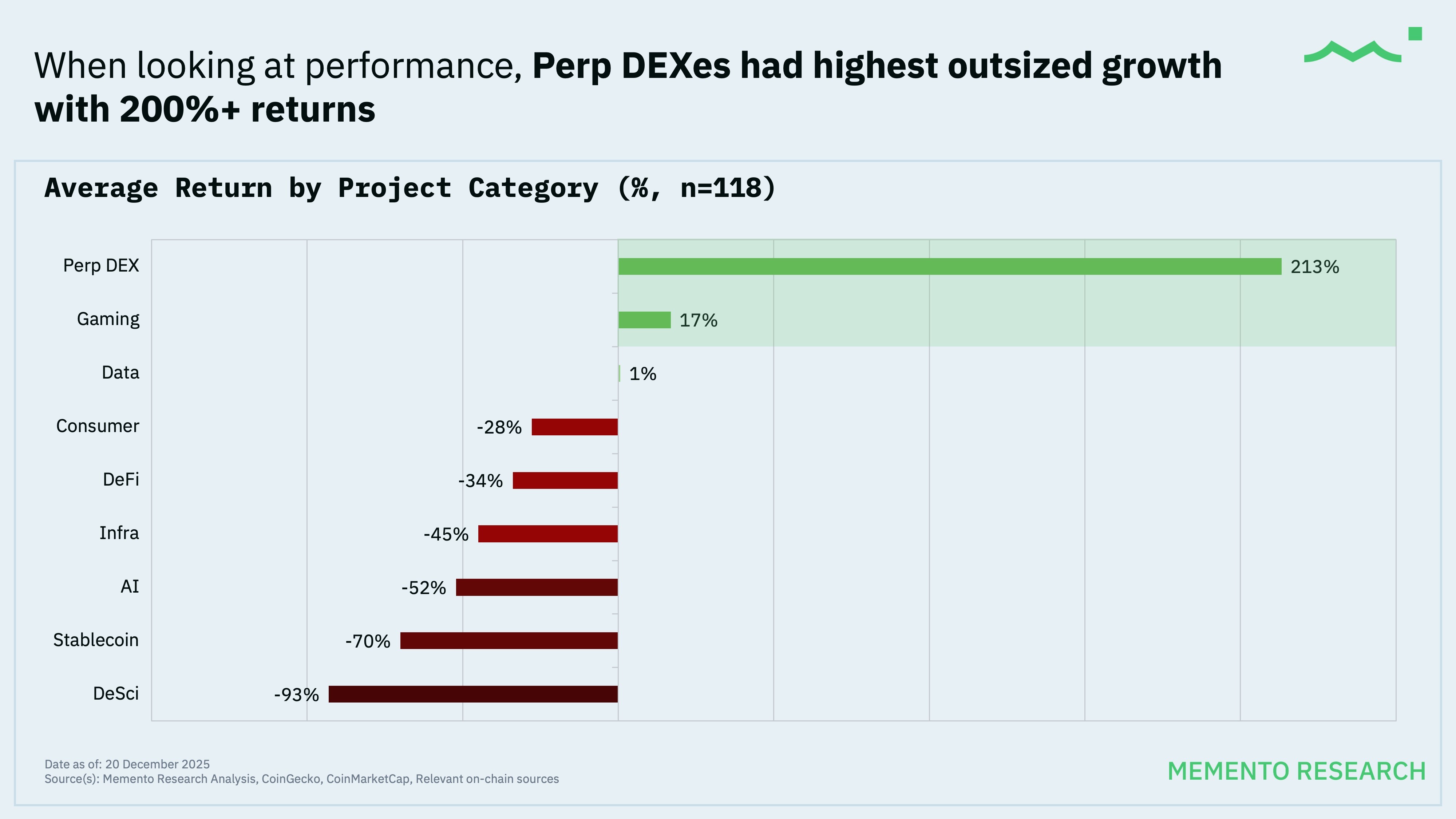 The theme for 2025 was the growth of Perp DEXes, led by Hyperliquid and during Q4 when Aster launched as well. Perp DEX (+213% average) was basically “one monster winner” in a tiny sample where the median is still negative.