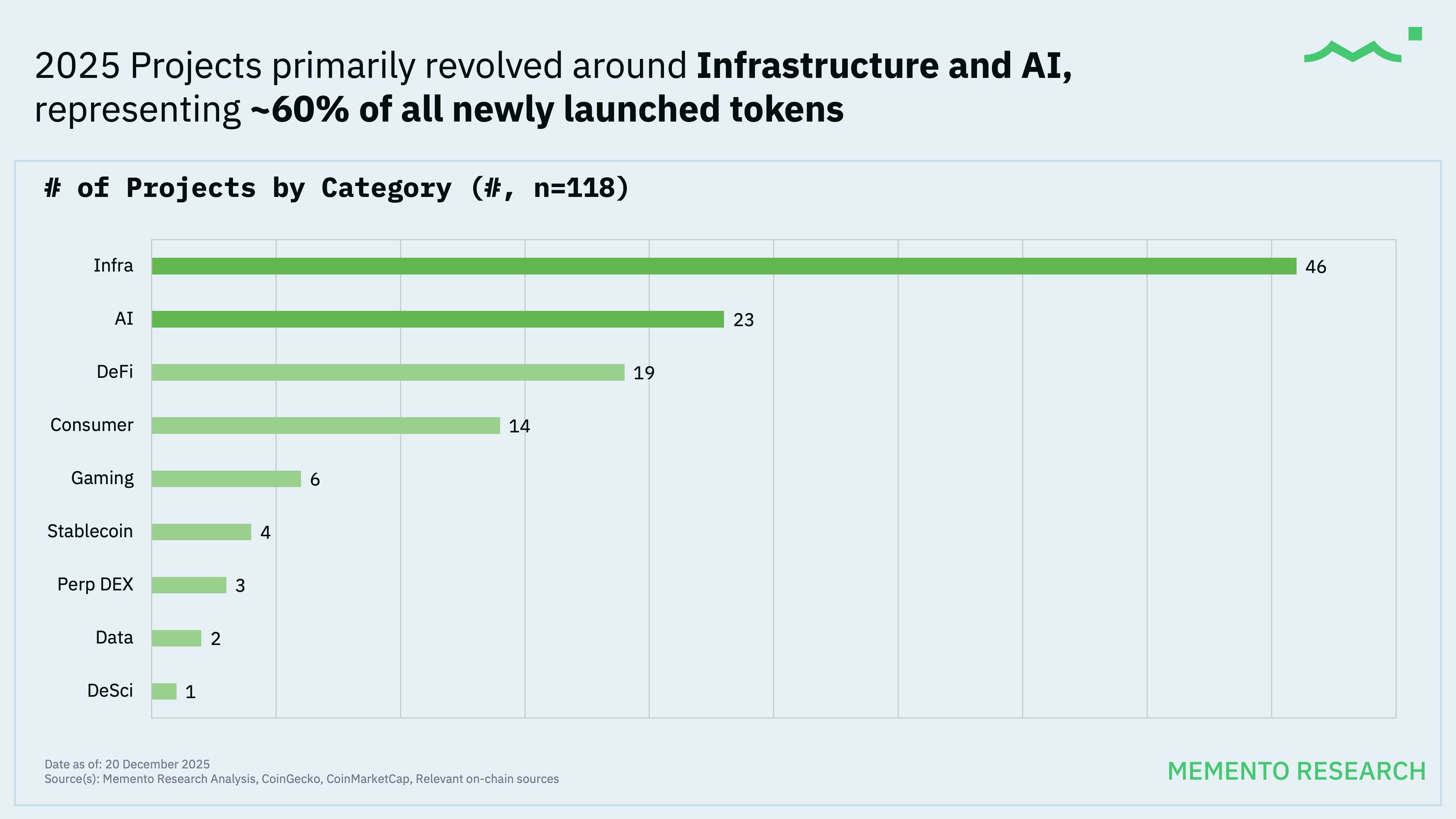2025 projects were concentrated in two main buckets which were Infra and AI, where they represent 60% of all newly launched tokens. However, what was interesting was their average and median return per category