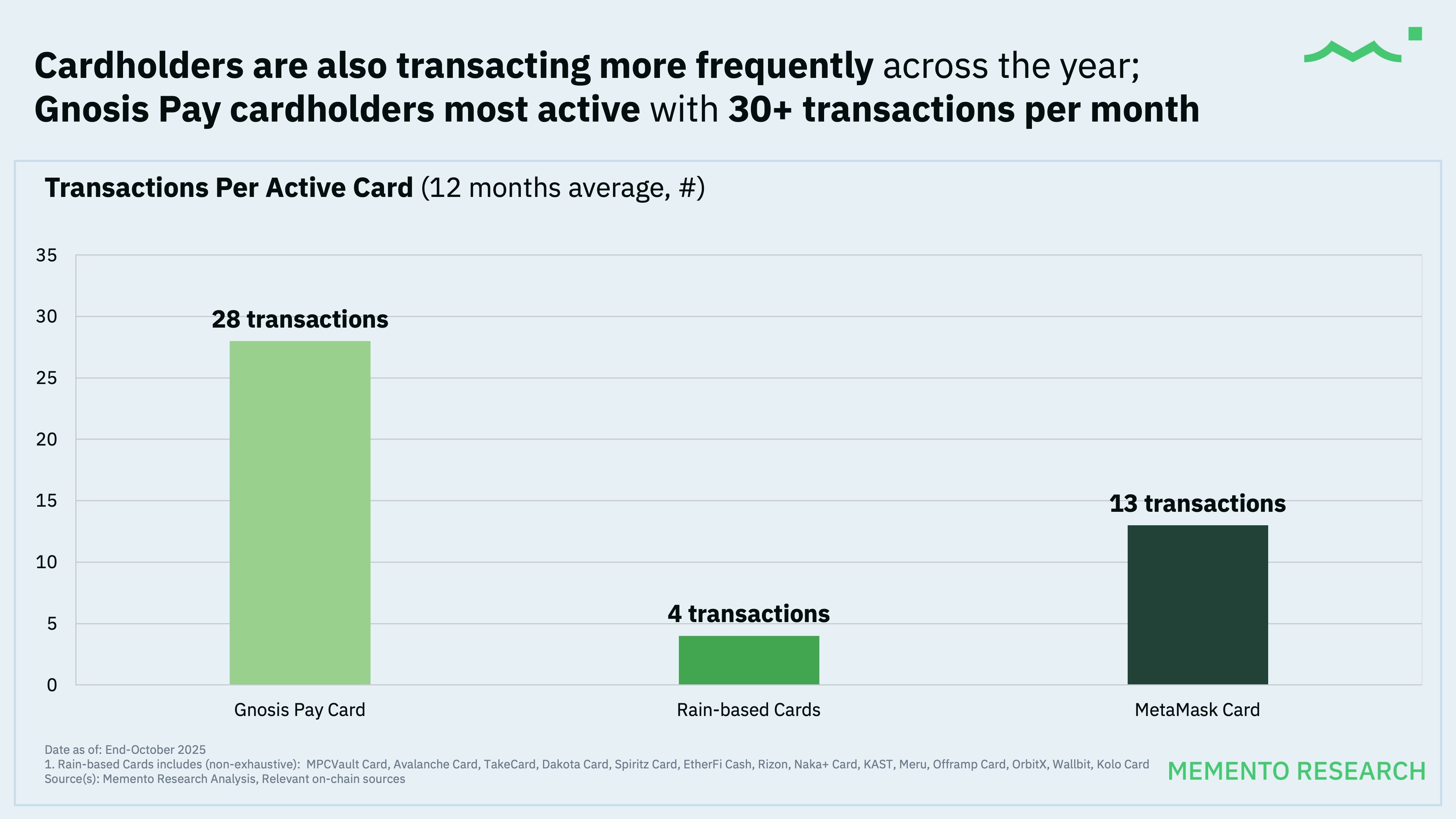 Transaction frequency is also increasing over time, with active cardholders transacting more frequently across the year; Similar to spends, Gnosis Pay cardholders are most active, averaging 30+ transactions per month, consistent with day-to-day payment behaviour.