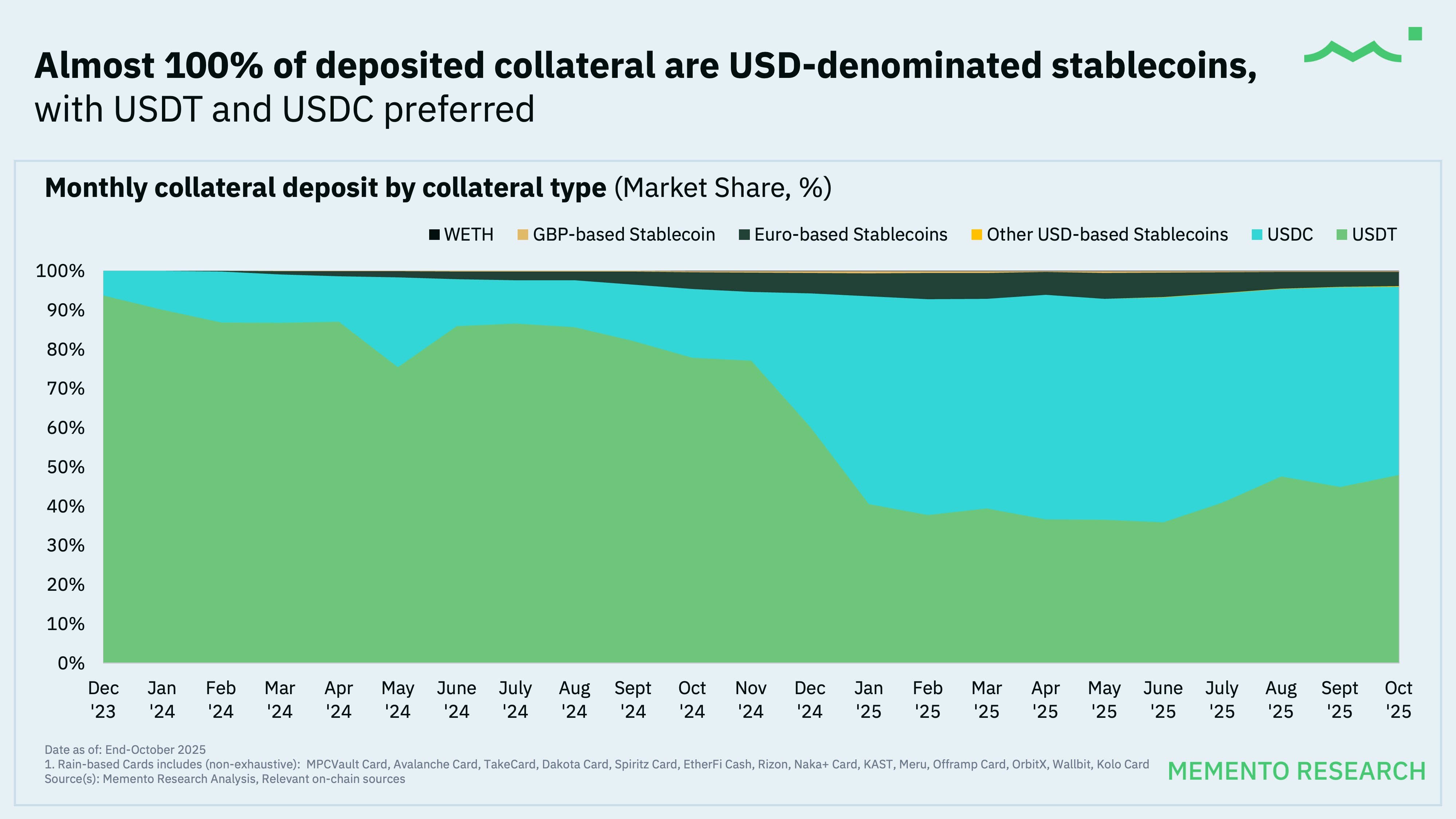 Rain-based cards consistently led deposit volumes, driven by their role as the underlying card infrastructure for a variety of popular crypto card programs → including EtherFi Cash, KAST, Offramp, and the Avalanche Card.