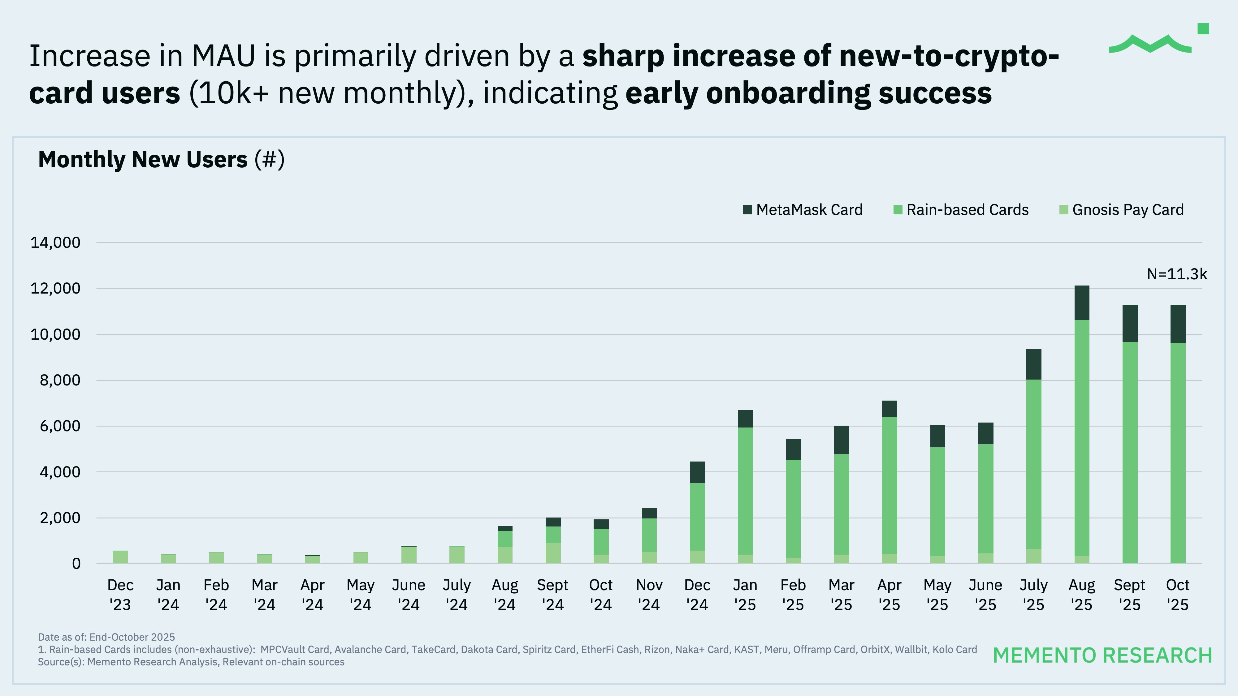 New user growth key factor for driving overall adoption, remaining firmly in an “onboarding-led” growth phase. This suggests that crypto card as an industry is still early in its adoption curve, with distribution and access continuing to expand.
