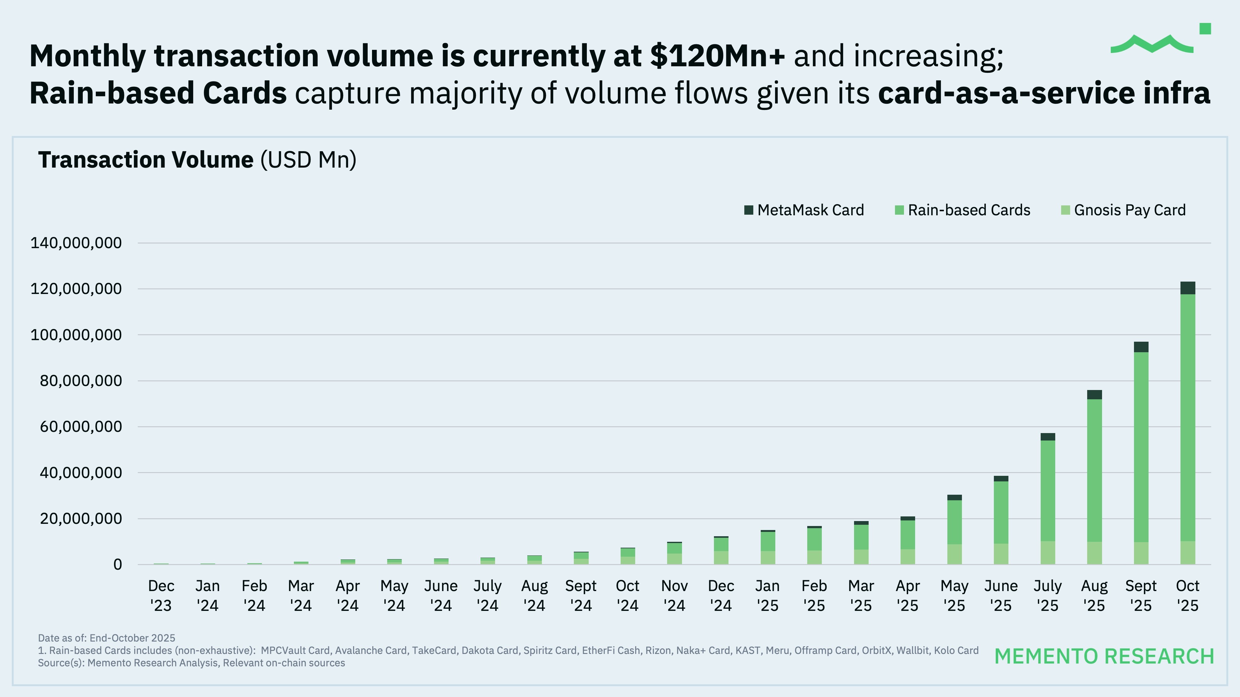 Transaction volumes exceeded $120M per month, with Rain-based cards dominating volume flows through shared infrastructure.