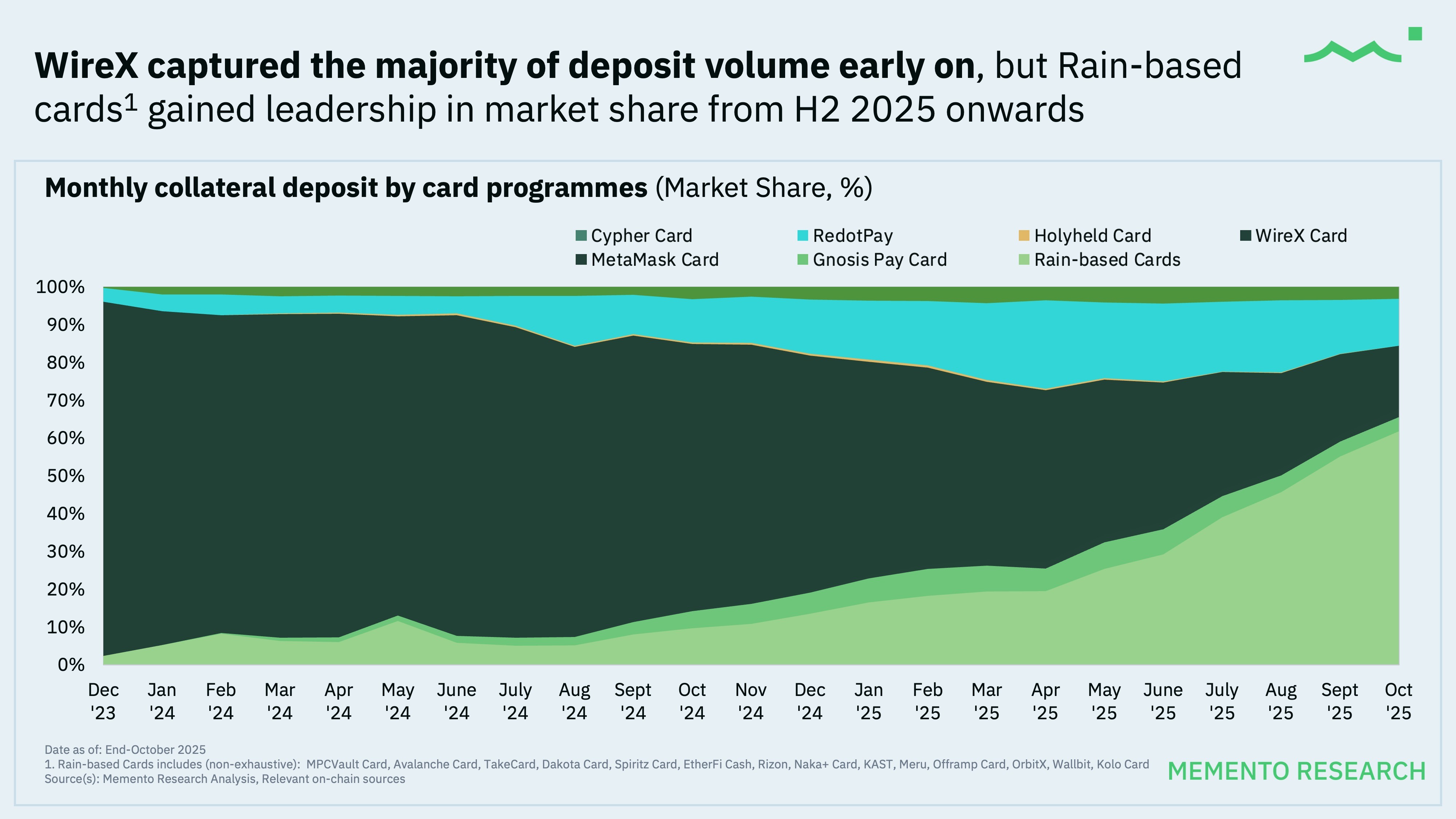 WireX captured the majority of deposit volume throughout much of 2024, but Rain-based cards gained leadership in market share from H2 2025 onwards.